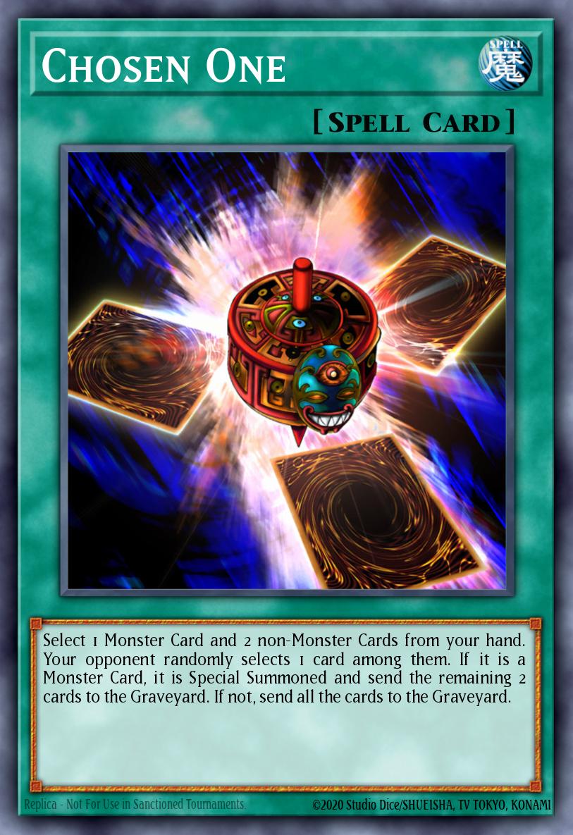 Select 1 Monster Card and 2 non-Monster Cards from your hand. Your opponent randomly selects 1 card among them. If it is a Monster Card, it is Special Summoned and send the remaining 2 cards to the Graveyard. If not, send all the cards to the Graveyard.