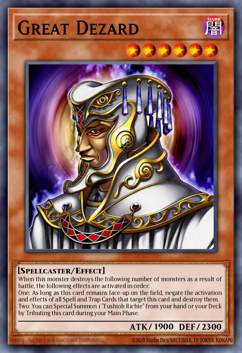 When this monster destroys the following number of monsters as a result of battle, the following effects are activated in order: One: As long as this card remains face-up on the field, negate the activation and effects of all Spell and Trap Cards that target this card and destroy them. Two: You can Special Summon 1 "Fushioh Richie" from your hand or your Deck by Tributing this card during your Main Phase.