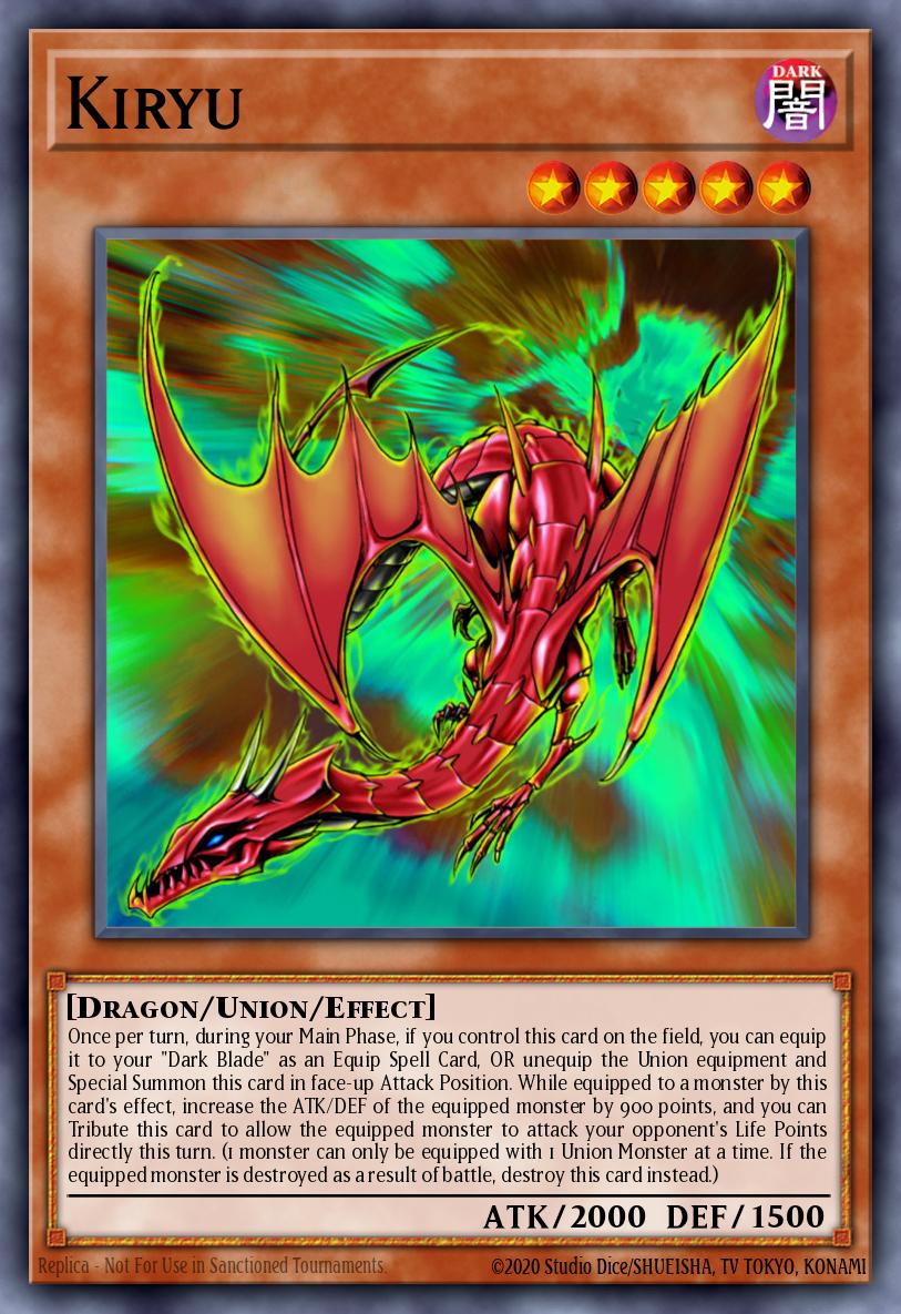 Once per turn, during your Main Phase, if you control this card on the field, you can equip it to your "Dark Blade" as an Equip Spell Card, OR unequip the Union equipment and Special Summon this card in face-up Attack Position. While equipped to a monster by this card's effect, increase the ATK/DEF of the equipped monster by 900 points, and you can Tribute this card to allow the equipped monster to attack your opponent's Life Points directly this turn. (1 monster can only be equipped with 1 Union Monster at a time. If the equipped monster is destroyed as a result of battle, destroy this card instead.)