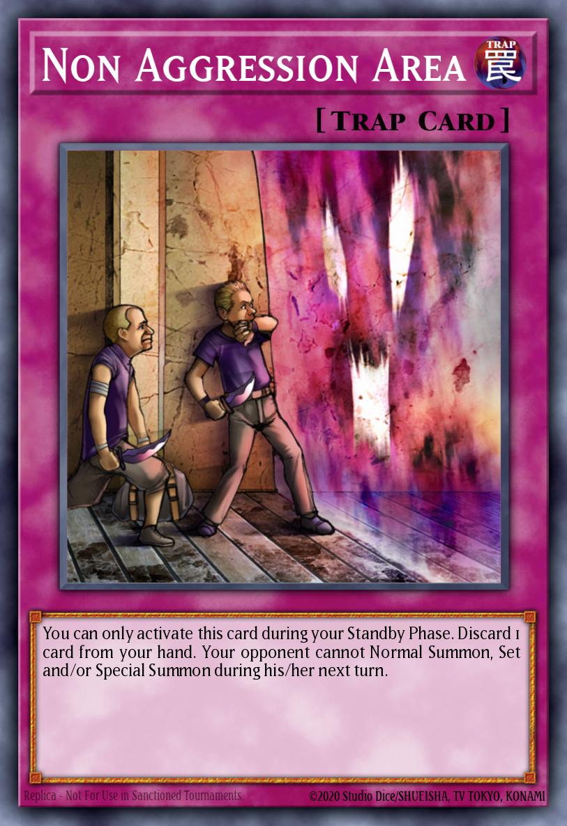 If your opponent Flip Summons "Cyber Jar" while "Non-Aggression Area" is active, because he cannot Special Summon, the cards he would normally Summon that were picked up are destroyed. All the cards picked up with "Cyber Jar" that would not normally be Special Summoned (such as high-level monsters, Spell and Trap Cards, and monsters that are Special Summon-only) remain in the hand and are not destroyed.