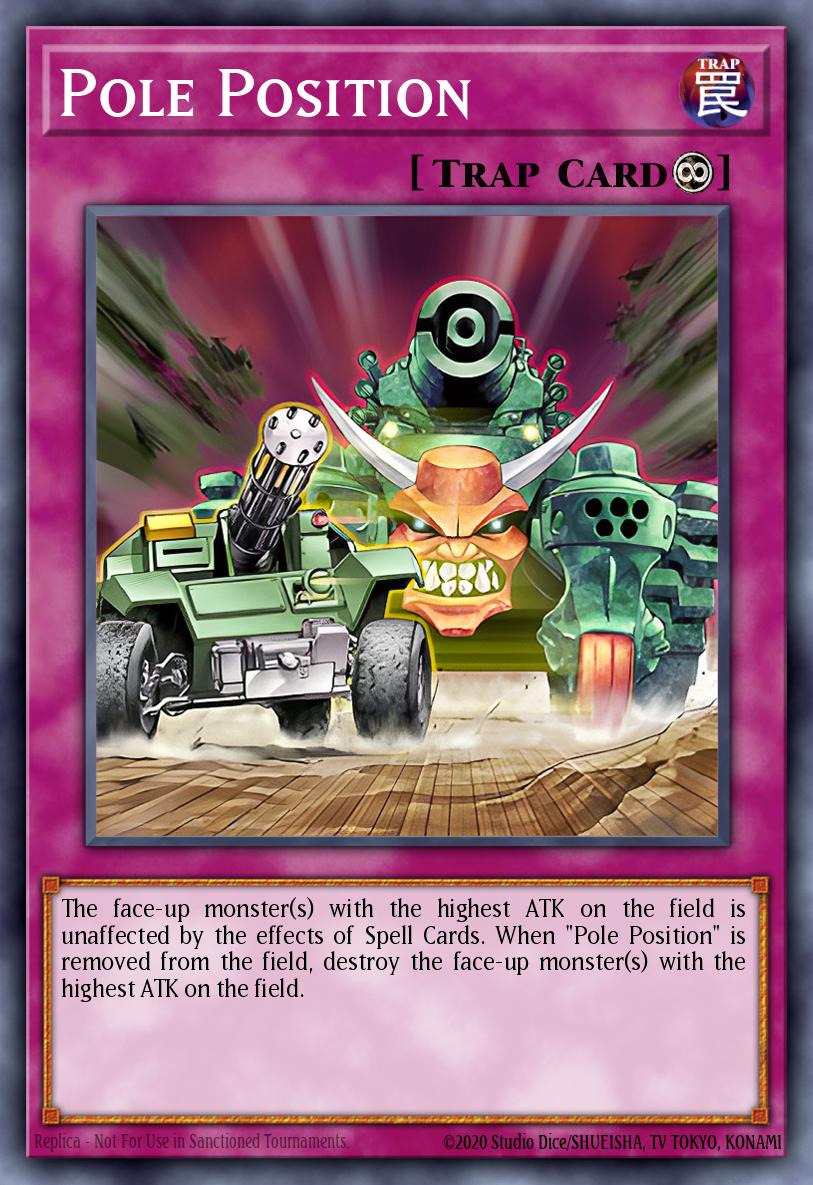 The face-up monster(s) with the highest ATK on the field is unaffected by the effects of Spell Cards. When "Pole Position" is removed from the field, destroy the face-up monster(s) with the highest ATK on the field.